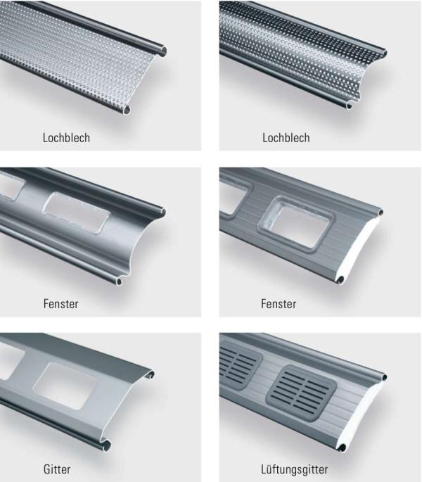 Die meisten Profile sind in den Ausführungen mit Lochblech- oder Gitterstanzungen und Fensterprofile lieferbar.